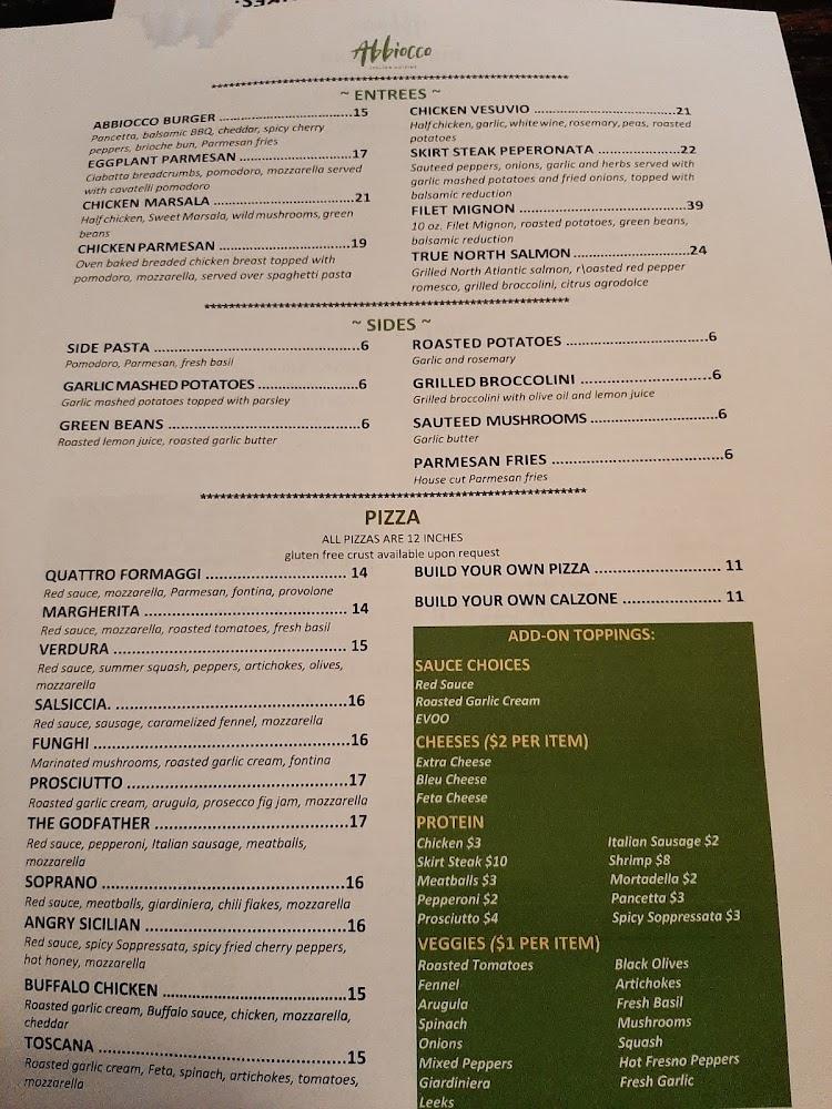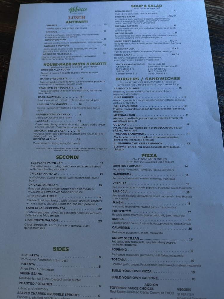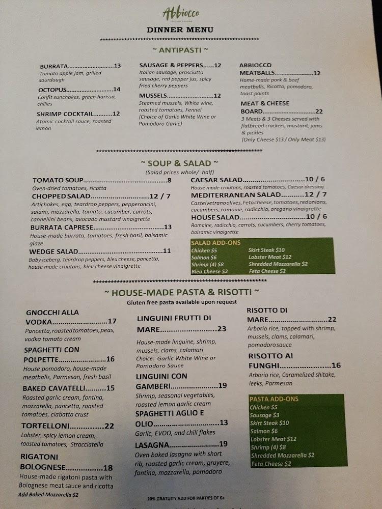 Experience the vibrant flavors of Italy at Abbiocco Italian Cuisine and unwind at Luna Rooftop Bar, all nestled in a stylish two-story setting in Chesterton, IN. Indulge in our homemade pasta, mouthwatering rustic pizzas, and expertly dry-aged steaks. Complement your meal with selections from our extensive wine list, unique cocktails, or local craft beers. Join us for lunch, dinner, or savor our delightful brunch on weekends. Enjoy the fresh air on our rooftop terrace while accessing our fully accommodating facilities. Make a reservation today for a memorable culinary journey!